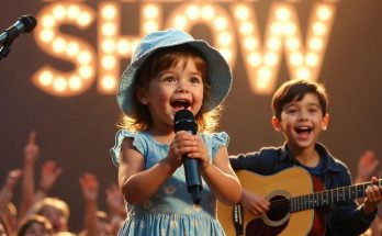 A young child sings into a microphone while sitting with an older man playing guitar, sharing a joyful musical moment on stage in front of a cheering audience.