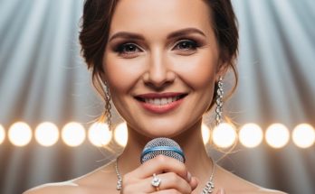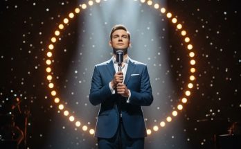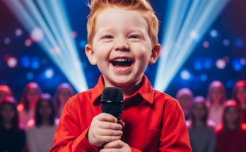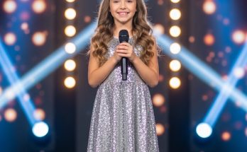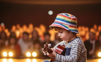 In this touching and emotional image, a performer sings into a microphone while gently playing a guitar, embraced from behind by a child. The moment feels intimate and genuine, capturing …