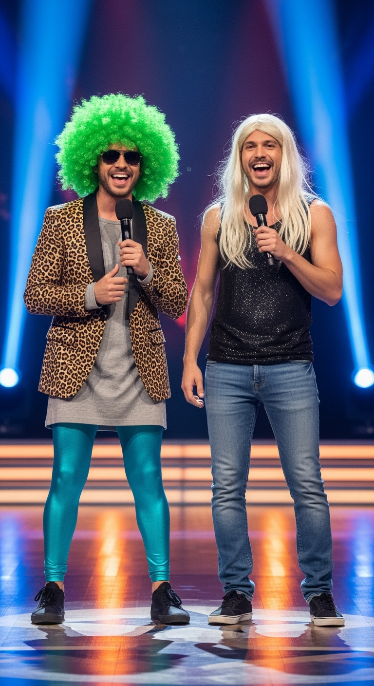 The routine was a hilarious musical roast that parodied love songs and relationship clichés, flipping typical R&B tropes into over-the-top punchlines. Emmanuel, in a green wig and cheetah jacket, delivered theatrical sass, while Phillip, rocking a glittery top and a ridiculously long blonde braid, leaned into the madness with full commitment. The crowd wasn’t sure what to think — but they were definitely entertained.