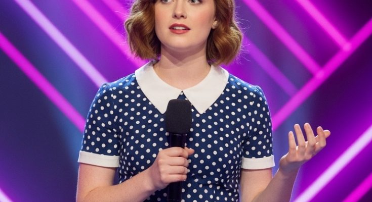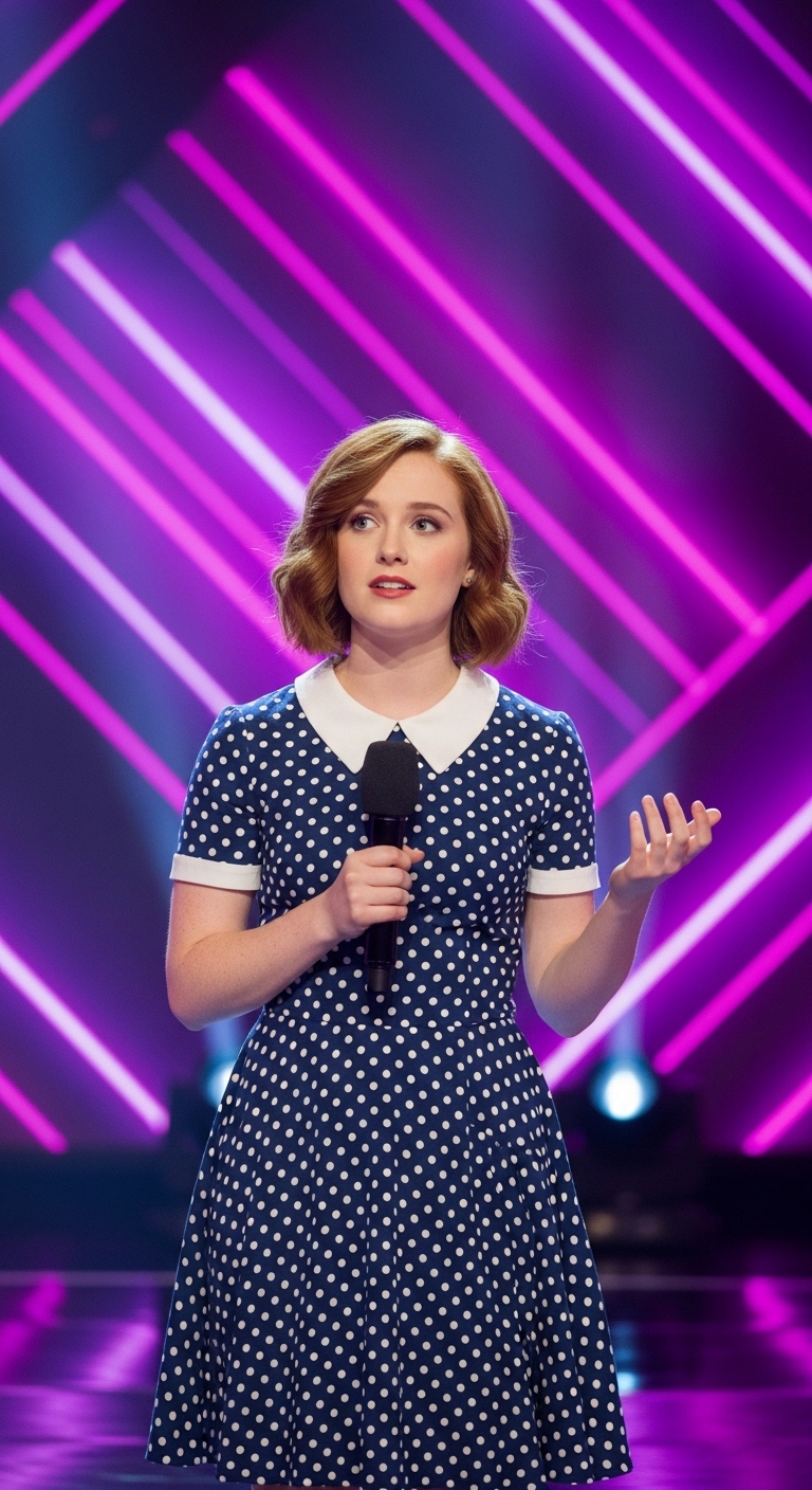 With her short auburn hair and vintage polka-dot dress, she looked almost like she belonged to another era — gentle, classic, understated. The glowing pink and purple LED backdrop made the moment feel even more dramatic, but she herself remained calm and soft-spoken, as if unsure whether anyone expected much.