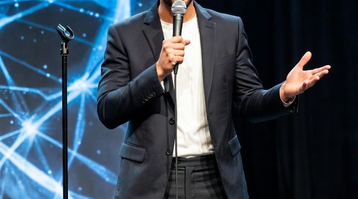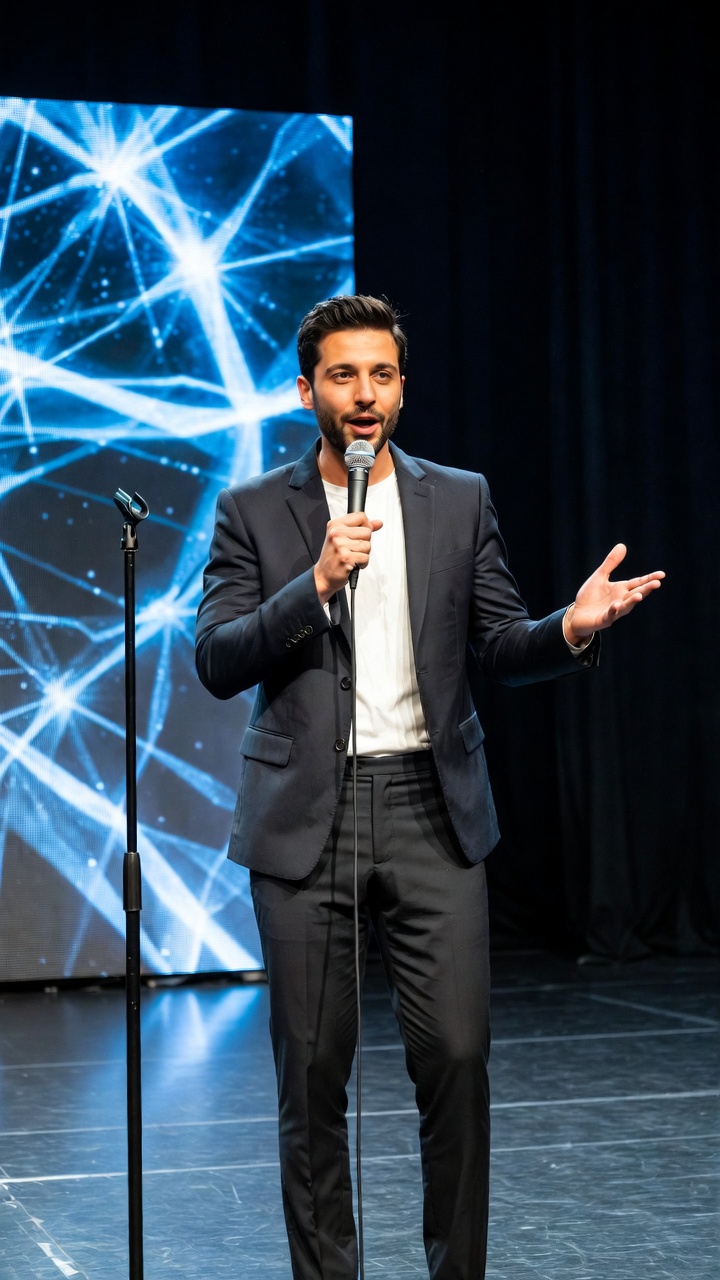 A quiet hush fell over the studio as a nervous contestant stepped onto the talent show stage, gripping his microphone with both hands. He wasn’t dressed like a flashy performer—just a patterned dark shirt, tan pants, and a grounded, steady posture—but his presence carried a different kind of weight. Under the sharp blue stage lights and geometric LED backdrop, it felt like the audience could sense there was a story behind this audition before he even sang a note.