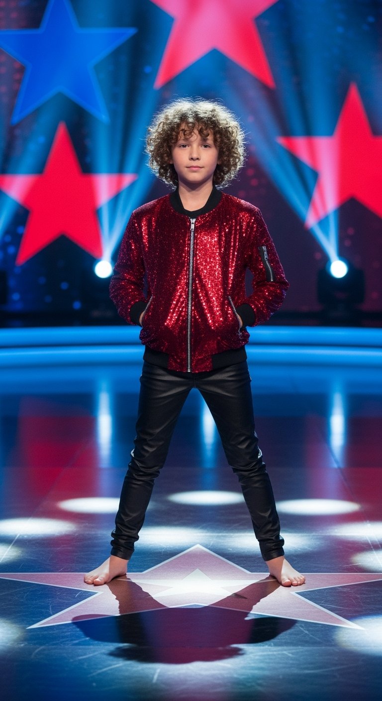 The America’s Got Talent stage turned electric as an 8-year-old dancer took center stage. Dressed in a striking red and black sequin jacket and shiny leather pants, he exuded confidence that belied his age. The audience was hooked from the first beat.