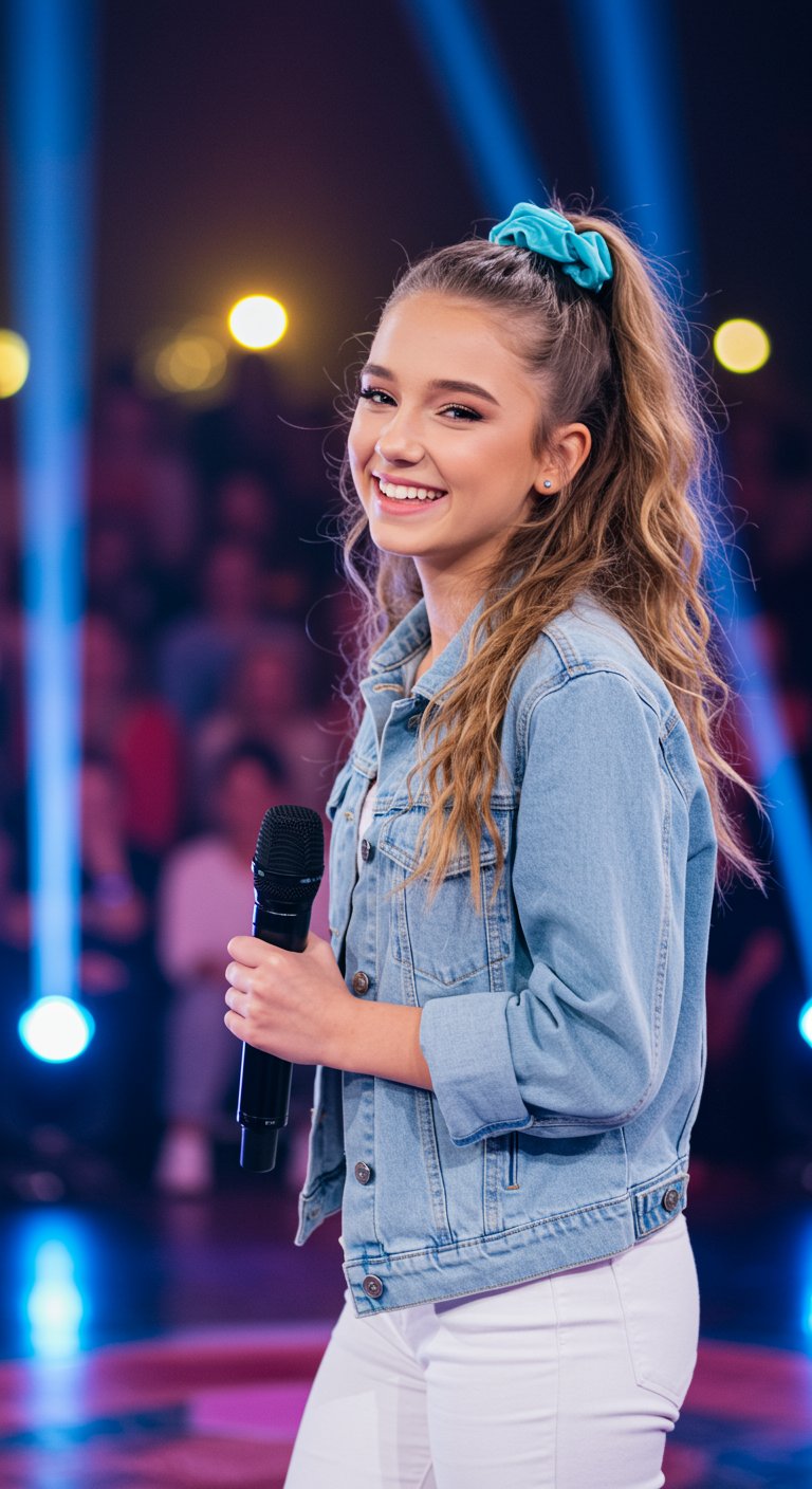 Dressed in a casual denim jacket that draped adorably over her tiny frame, Eseniia gripped the microphone and spoke with a confidence far beyond her years. Her voice may have been small, but it was packed with joy and innocence. Her presence alone lit up the room before she even sang a note.