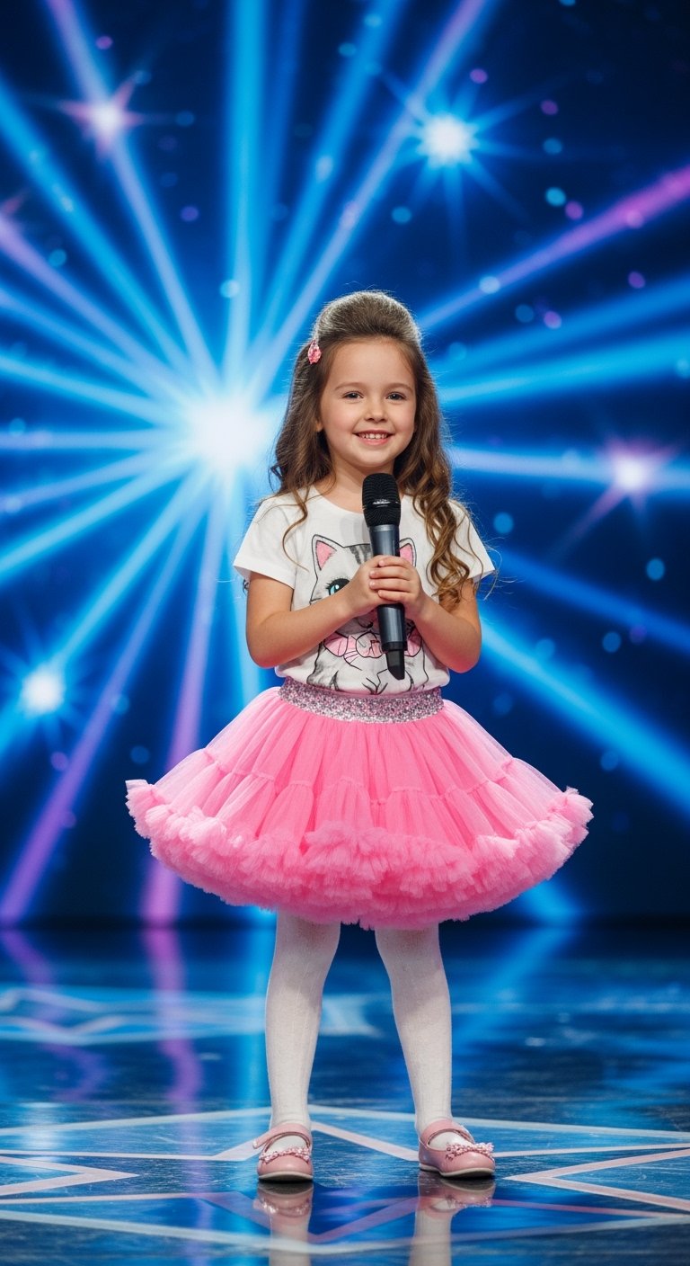 In one of the most heartwarming auditions of the season, 6-year-old Zoe Erianna took the America’s Got Talent stage with a performance that radiated pure joy and excitement. Wearing a sparkling pink tulle skirt, a white cat t-shirt, and pink sneakers, Zoe’s outfit was as playful and bright as her smile. Her confident stance and beaming expression set the tone for a performance that would leave a lasting impression.