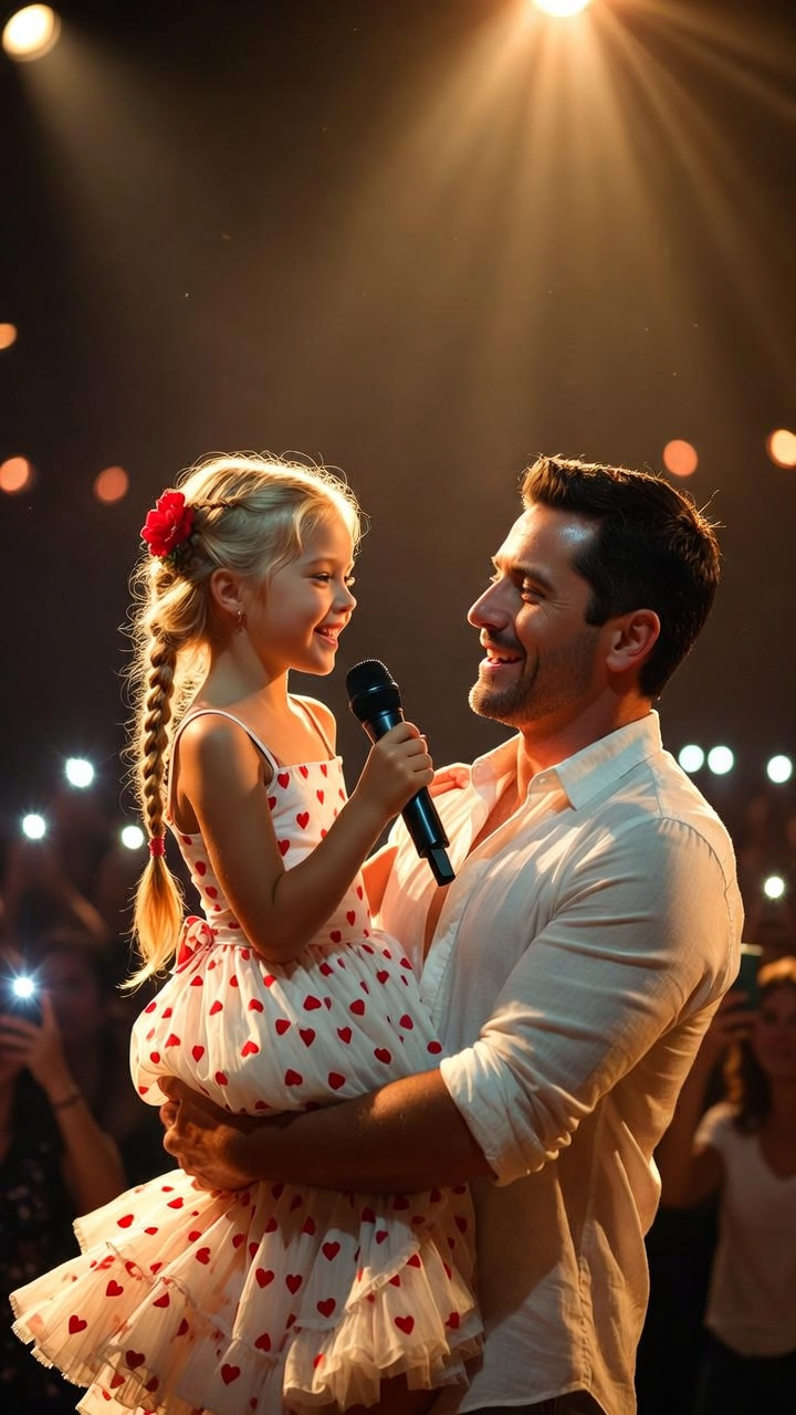 A young girl, dressed in a charming white dress with red hearts, holds a microphone and sings with confidence and happiness. Her bright smile reflects pure excitement, as she performs in front of a cheering crowd. In her father’s arms, she finds both comfort and encouragement, making the stage feel like the safest place in the world.