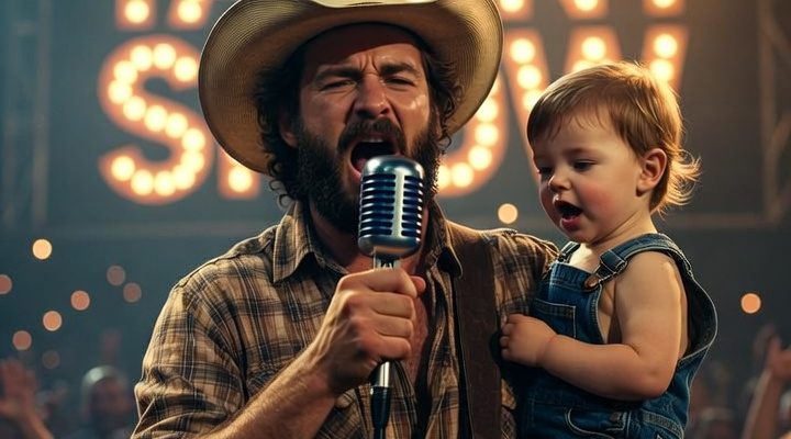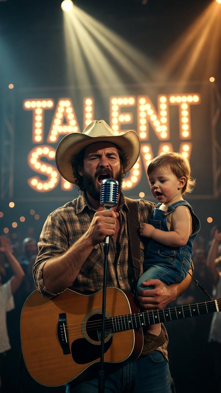 A man stands under bright stage lights, singing with intensity into a vintage microphone. His voice carries emotion, energy, and experience. In his arms, he holds a toddler dressed in simple overalls, watching and reacting to the performance with innocent curiosity. Together, they create a striking contrast—strength and softness, experience and new beginnings.