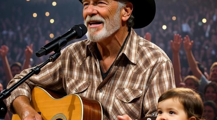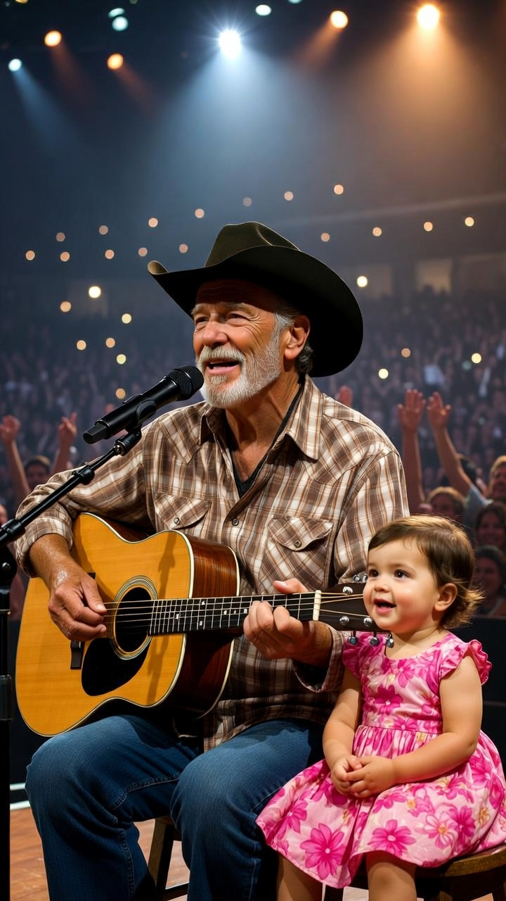 In this beautiful moment, an older man sits on stage, gently strumming his guitar while singing into a microphone. His voice carries warmth, experience, and a lifetime of stories. Beside him, a young child in a bright pink dress sits quietly, watching and smiling, completely immersed in the moment.