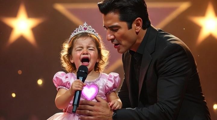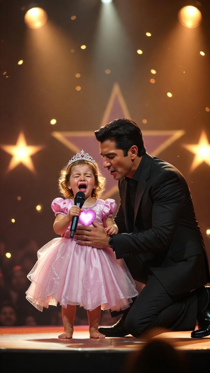 In this powerful scene, a young girl stands on stage in a soft pink dress, her tiny hands gripping the microphone as emotion overwhelms her. Her voice may tremble, but her presence speaks volumes. Beside her, a man kneels gently, offering comfort and encouragement, reminding her that she is not alone.