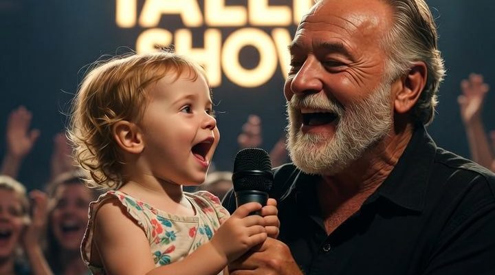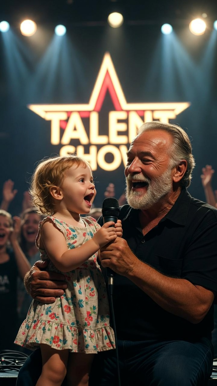 In this lively scene, a young child and an older man stand side by side, both singing into the same microphone with bright, expressive faces. The child’s excitement is contagious, her voice filled with enthusiasm and wonder. The man, smiling warmly, matches her energy, creating a moment that feels natural, playful, and deeply meaningful.