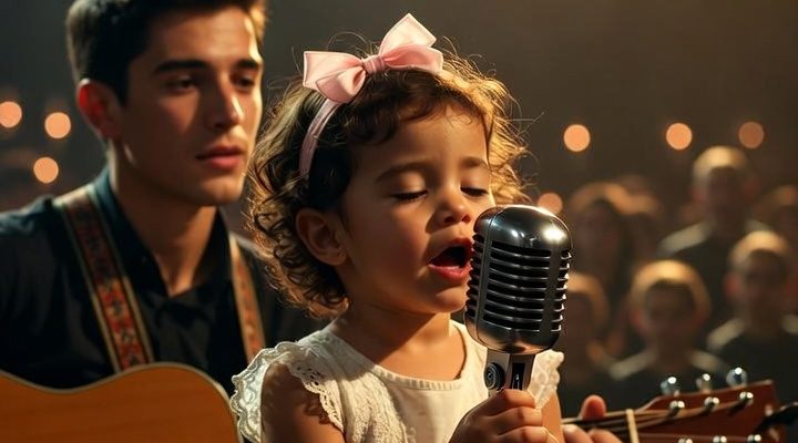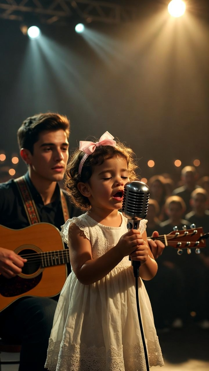 In this serene scene, a young girl stands at a vintage microphone, her eyes gently closed as she sings with quiet focus. Dressed in a soft white dress, she carries an innocence that makes the moment feel pure and genuine. Every note she sings seems to come from a place of calm and sincerity.