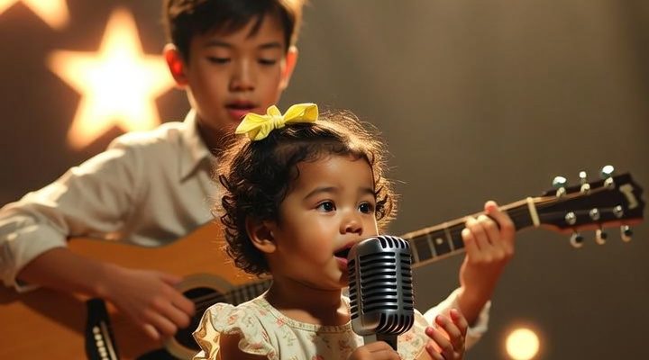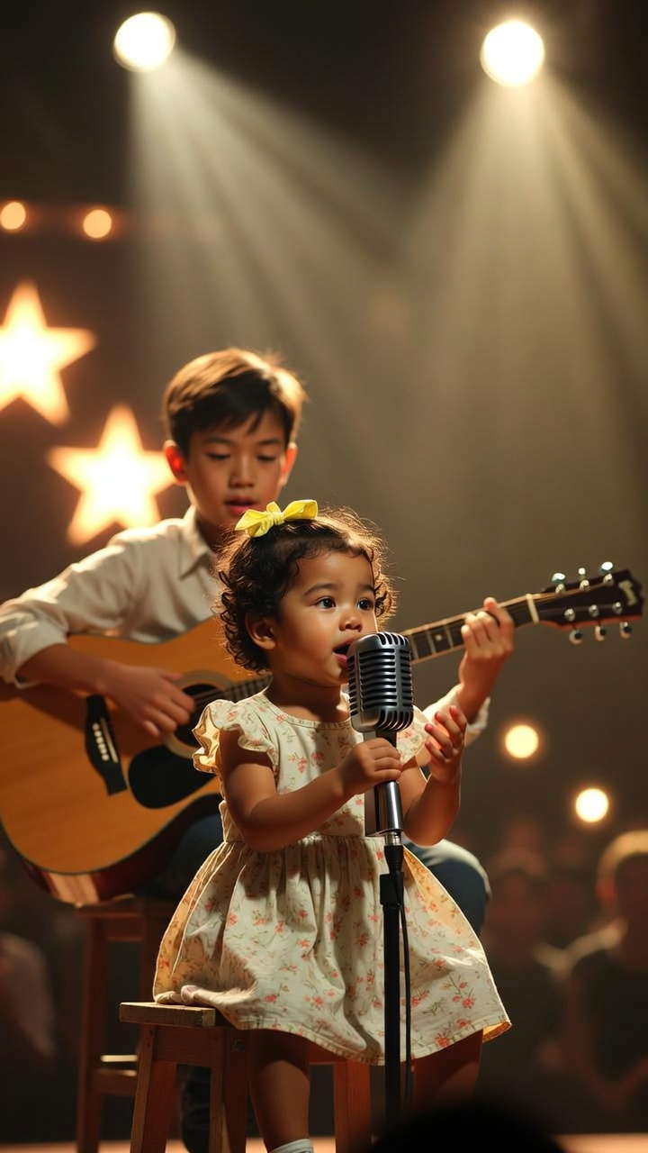 Behind her, a young boy plays the guitar, offering steady rhythm and quiet support. His presence adds a sense of teamwork and encouragement, turning the moment into a shared experience rather than a solo act.
