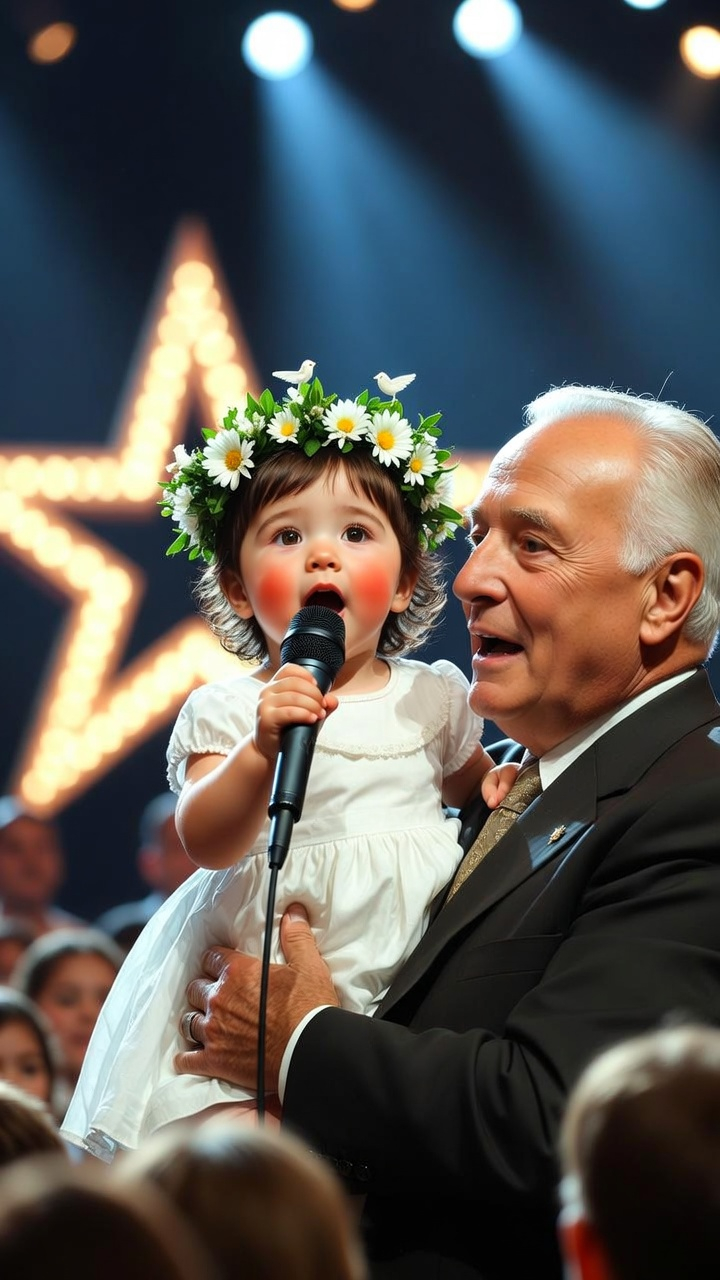 In this enchanting moment, a young child dressed in a soft white outfit stands in the spotlight, gently held by an older man. A delicate crown of flowers rests on her head, adding a sense of innocence and charm to her presence.
