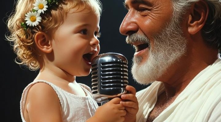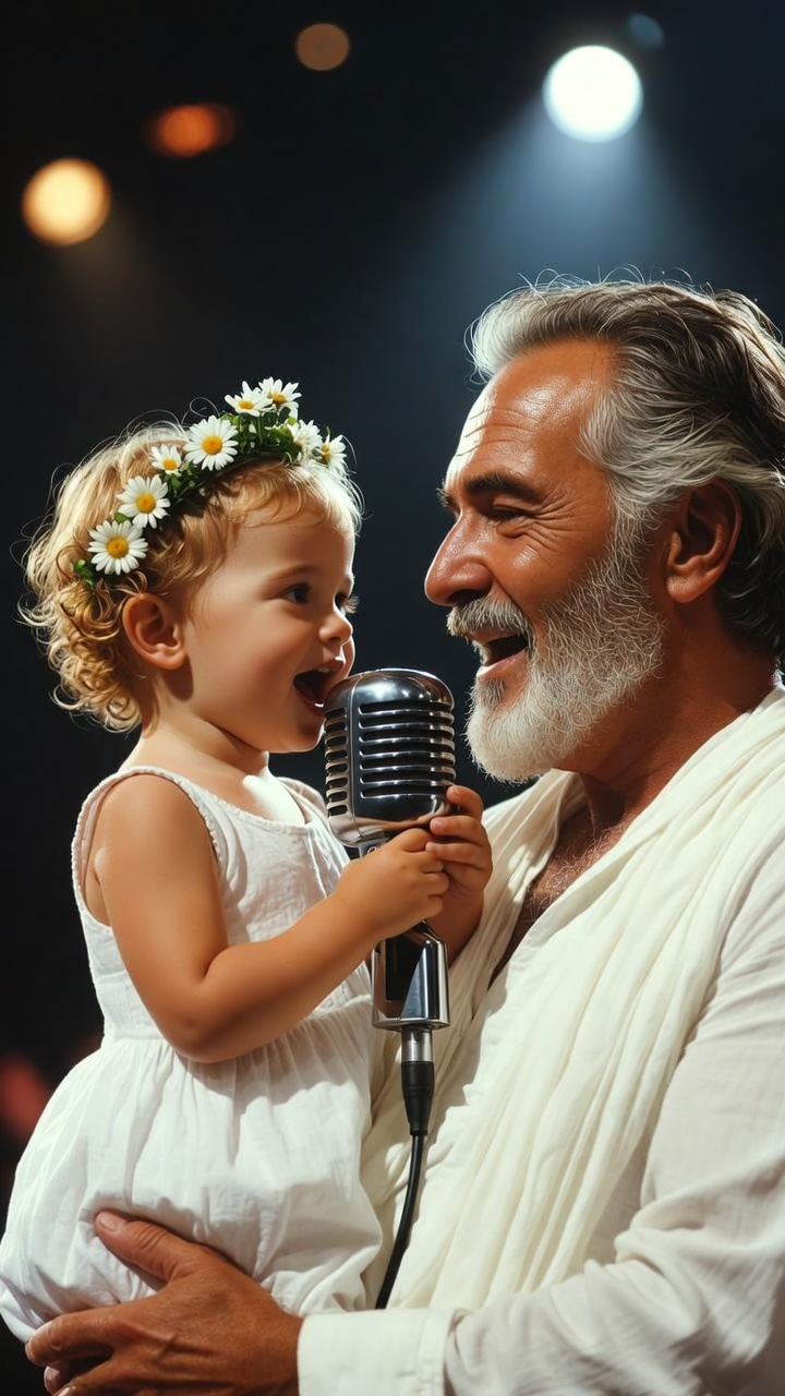 In this touching scene, a young child and an older man share a microphone, their faces lit with joy and warmth. The child, dressed in soft white and wearing a delicate crown of flowers, sings with pure excitement, her voice full of innocence and wonder.