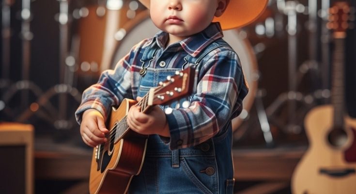 In this charming scene, a young child stands on stage holding a tiny guitar, dressed in a cowboy hat, denim overalls, and boots. Though small in size, the child’s presence carries a quiet determination that captures attention instantly.