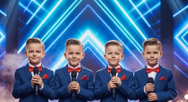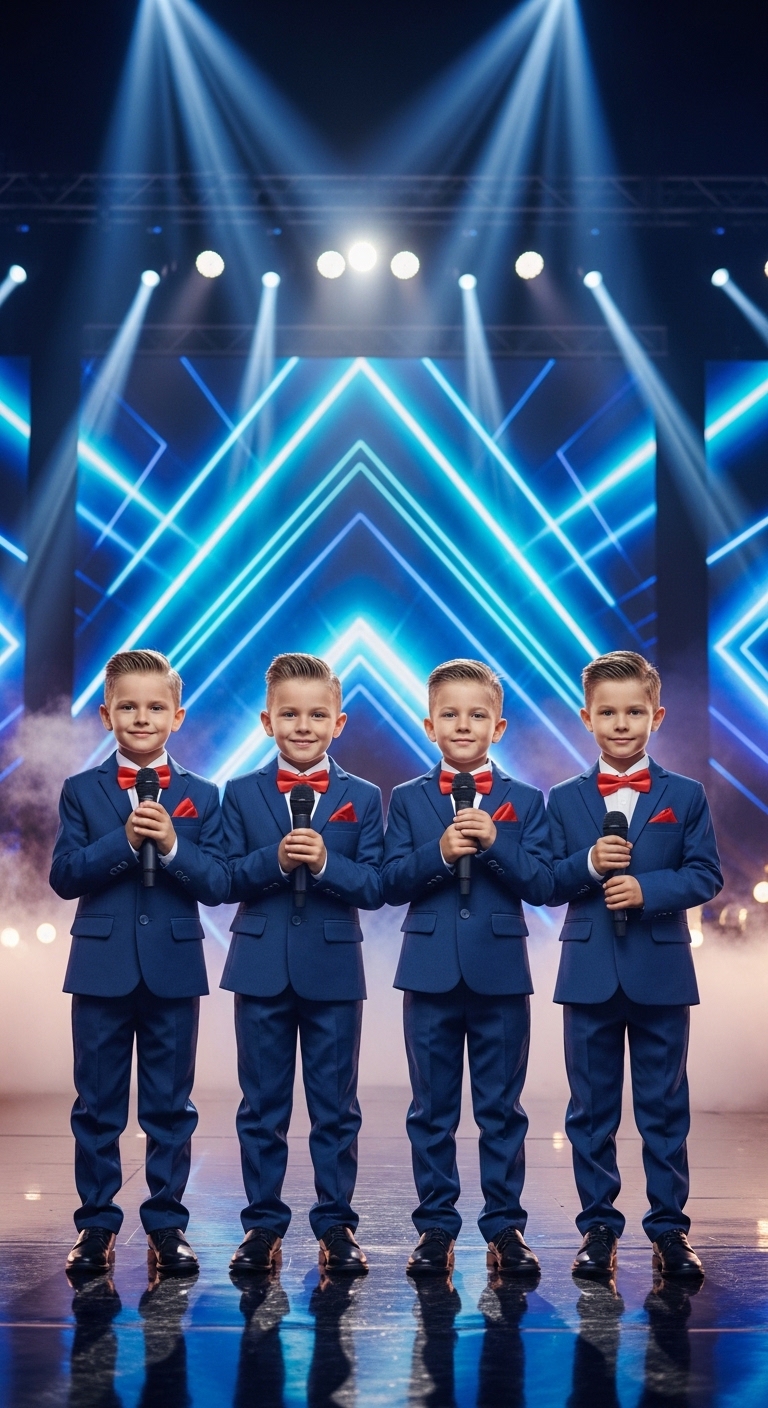 In this striking scene, four young boys stand side by side on a brightly lit stage, dressed in matching blue suits with bold red bow ties. Each one holds a microphone, ready to perform, yet together they create a presence that’s far greater than any solo act.