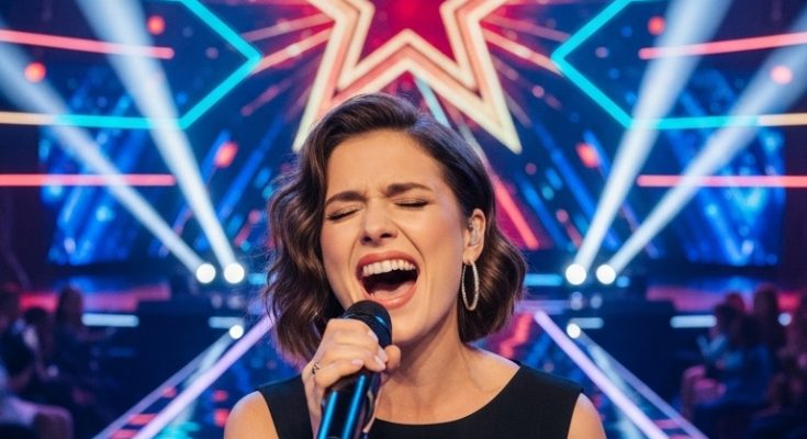 In this powerful moment, a singer stands center stage, eyes closed and heart fully open, delivering a performance that feels as real as it is unforgettable. Every note carries emotion, every expression tells a story, and every second holds the audience in silence and awe.
