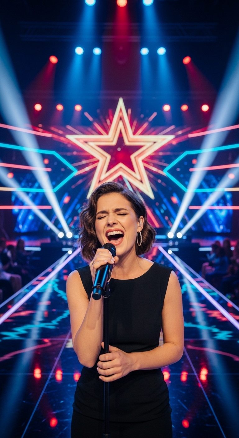 The glowing star behind her and the vibrant lights surrounding the stage create a dramatic backdrop—but the true energy comes from within. It’s not just about hitting the right notes; it’s about feeling them, living them, and sharing them without fear.