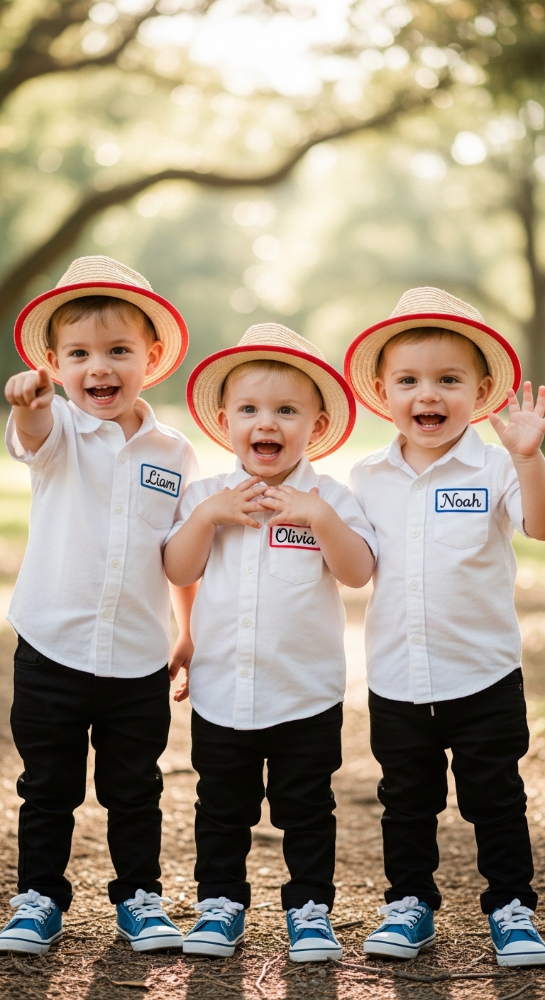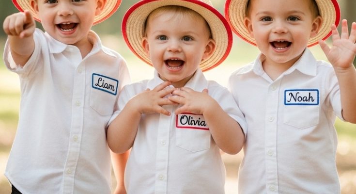 In this heartwarming scene, three toddlers stand side by side, dressed in matching outfits but proudly wearing their own names. Liam, Olivia, and Noah—each one different, each one full of life.