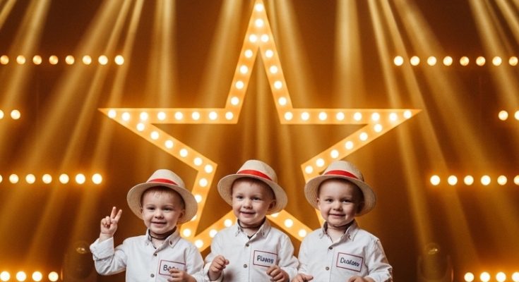 Three smiling toddlers stand under golden stage lights, glowing in front of a bright star backdrop.