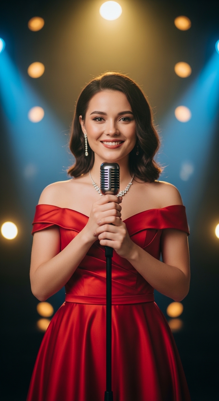 She walked onstage quietly, almost unnoticed. A girl in a plain blue dress, no sparkles, no makeup tricks, no entourage. Just her. Small frame. Big eyes. Clutching the mic like it might disappear if she let go.