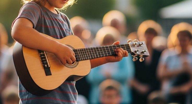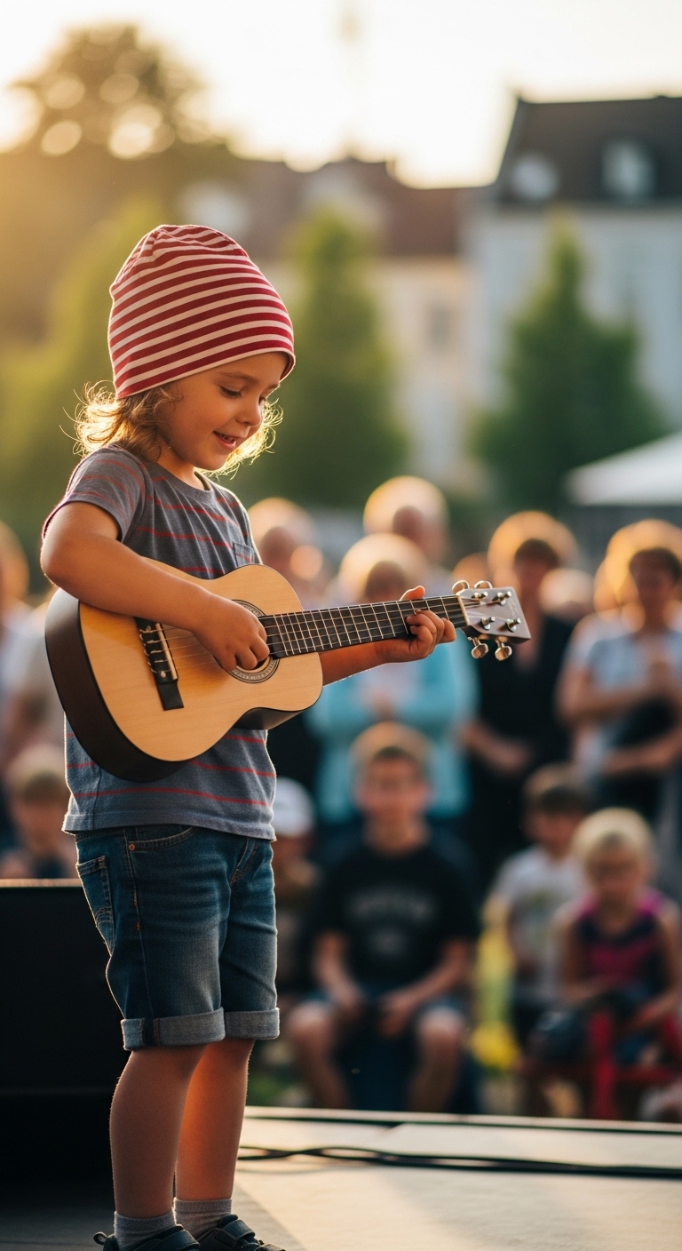 With every gentle strum, the child creates something real. No pressure, no expectations—just pure joy flowing through music. The world fades into the background, and all that remains is the rhythm of a dream beginning to take shape.