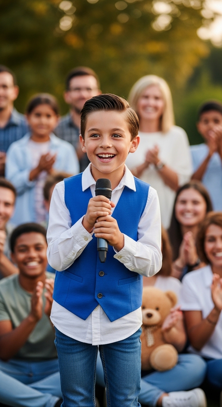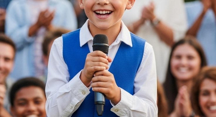 A smiling young boy holds a microphone while a supportive crowd behind him claps and cheers.
