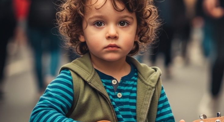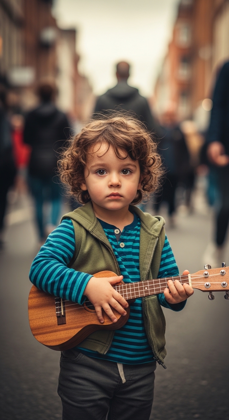 A young child stands in the middle of a busy street holding a small instrument, calm and focused amid the crowd.