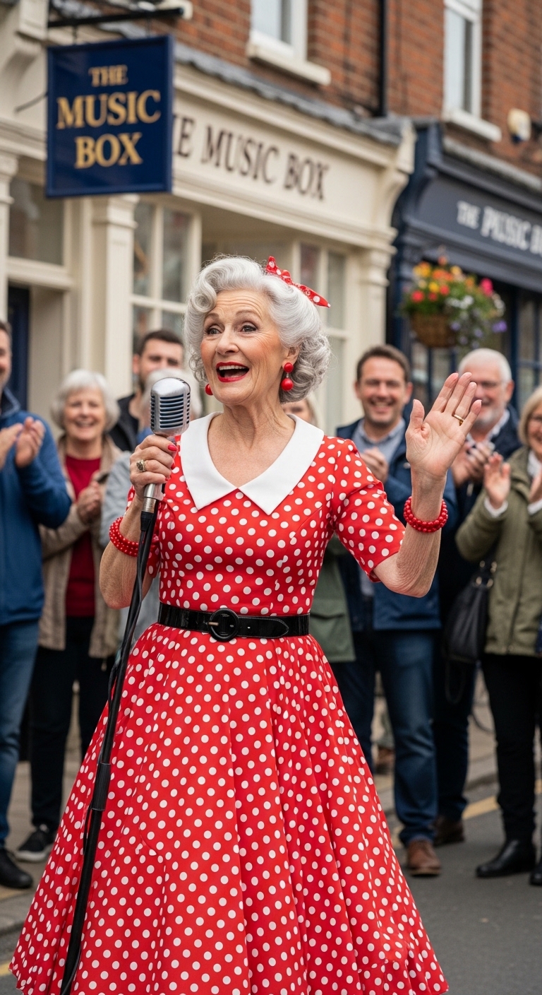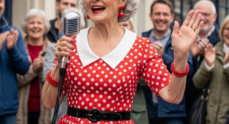 An older woman sings joyfully on a lively street, surrounded by a cheering crowd.