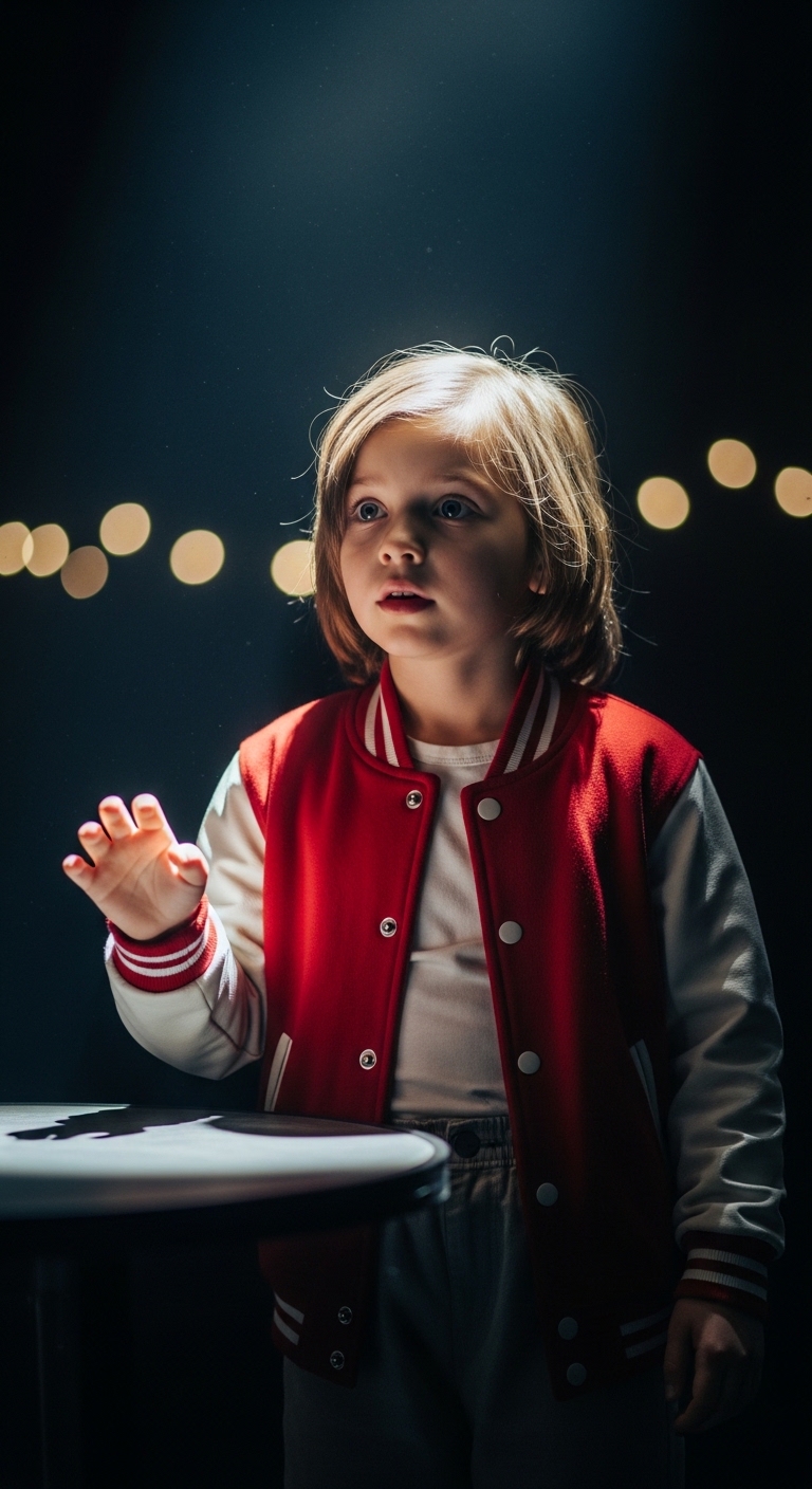 There is something deeply moving about the way children experience the world. In this image, a young child stands quietly, illuminated by soft, glowing lights that blur into the background. Their wide eyes and slightly raised hand suggest a moment of pure discovery—an instant where curiosity takes over and imagination begins to unfold.