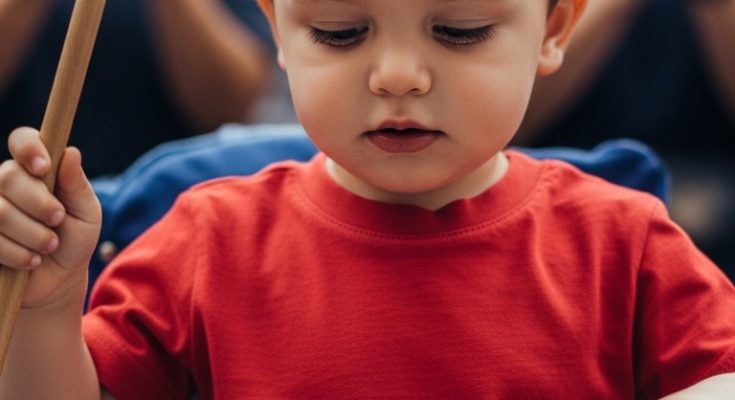 In this captivating moment, a young child sits with drumsticks in hand, fully focused on creating sound and rhythm. Their expression is calm yet concentrated, showing a deep level of engagement that goes beyond play—it is the beginning of learning, creativity, and self-expression.