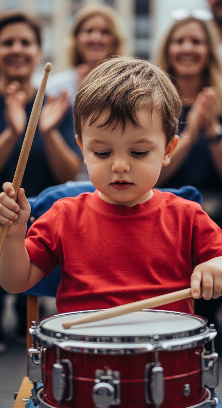 A young drummer discovers rhythm and focus, surrounded by encouragement and applause.