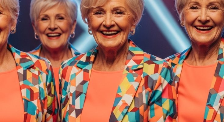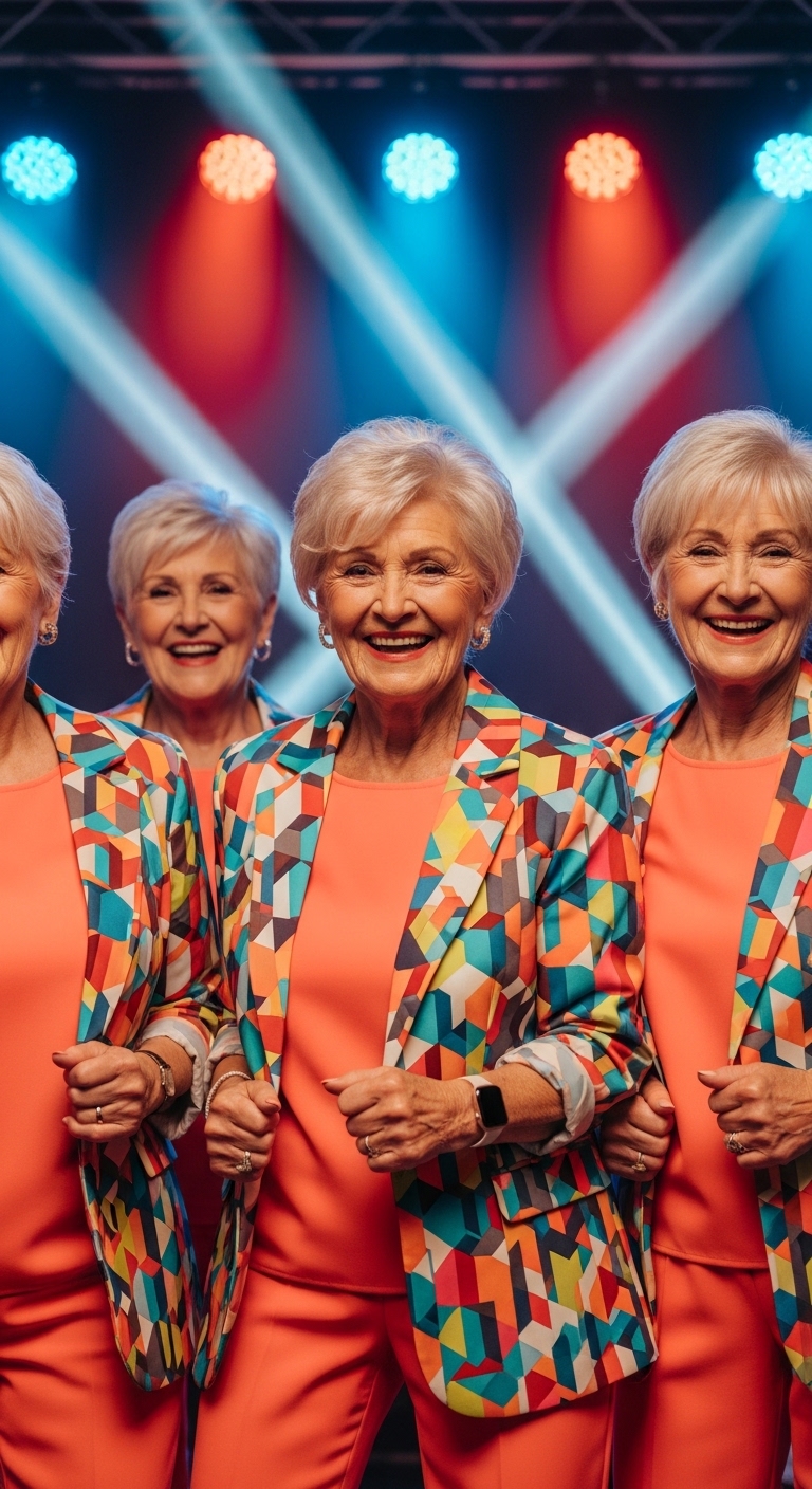 In this vibrant and uplifting image, a group of older women stand together under bright stage lights, smiling with confidence and energy. Dressed in colorful outfits, they radiate joy, unity, and a sense of celebration. Their presence challenges expectations and redefines what it means to perform, to express, and to shine—at any age.