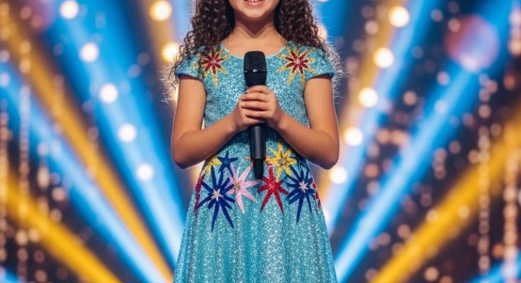 In this radiant image, a young girl stands confidently under dazzling stage lights, holding a microphone with a bright and genuine smile. Her posture is relaxed yet poised, reflecting both excitement and self-assurance. It is a moment filled with promise—the beginning of a journey where dreams start to take shape.