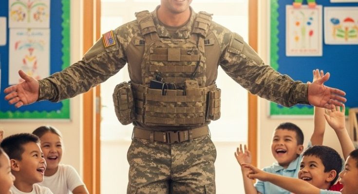 The soldier, dressed in uniform, stepped inside with arms wide open. His daughter froze for just a moment before her expression lit up with recognition. She rushed toward him, her laughter filling the room as classmates and teachers watched with wide smiles and misty eyes.